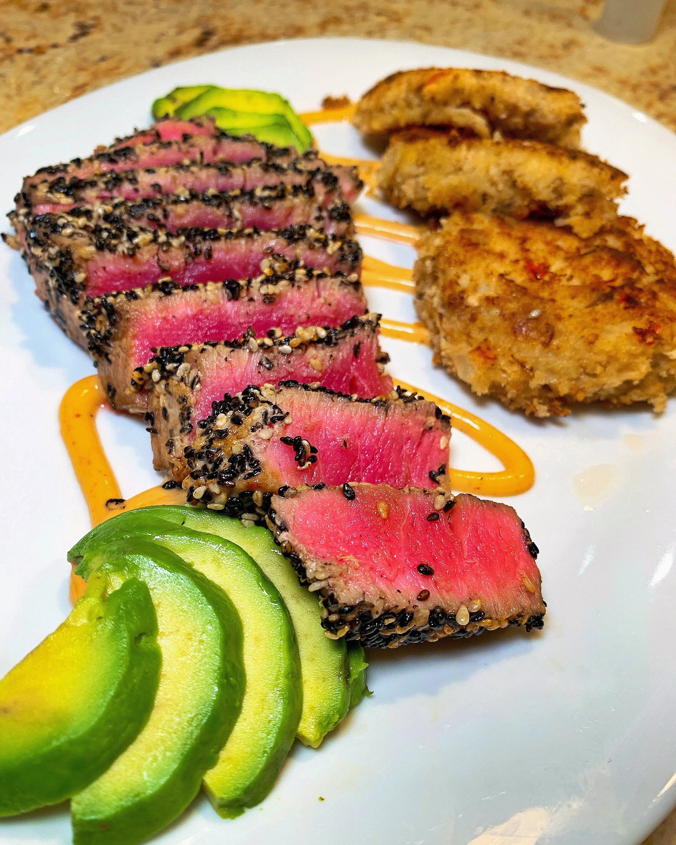 Remove excess soy from tuna, spread wasabi all over surface of fish